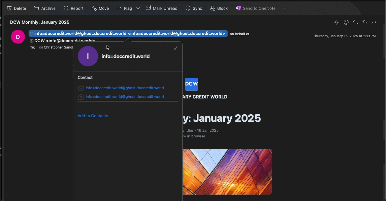 Note: depending on your email client, the sender may show as info=doccredit.world@ghost.doccredit.world in your Outlook or info@doccredit.world in other email clients. Both of these are correct, and can be safely added to your contacts or whitelisted.
