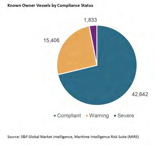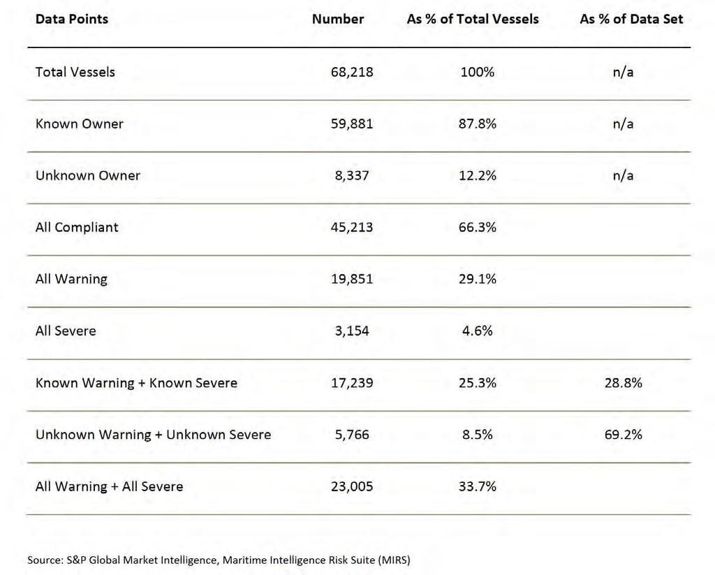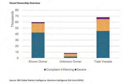 Data reviewed was provided by S&P Global Market Intelligence and is current as of March 2023. Authenticated data for 68,218 vessels were identified and sorted into various categories for analysis. The major delineation was whether Group Owner information was Known or Unknown regarding a particular vessel. The next distinguishing factor was a regulatory compliance assessment for each vessel of either (1) Compliant; (2) Warning; or (3) Severe. As stated in the Definitions section below, each compliance assessment carries a precise meaning.