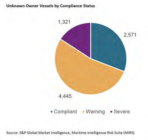 As nearly 70% of vessels with Unknown Owners carry either a Warning or Severe compliance assessment, financial institutions, insurance companies and port security agencies should exercise due diligence when met with Unknown Owner vessels.