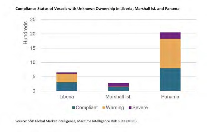 In fact, some industry professionals have disregarded flags within their compliance assessments. Based on our dataset of the top three countries in terms of vessels registered, those vessels with an Unknown Owner had rates of “Warning” or “Severe” compliance status between 47.8% (the Marshall Isl.) and 61.2% (Panama).